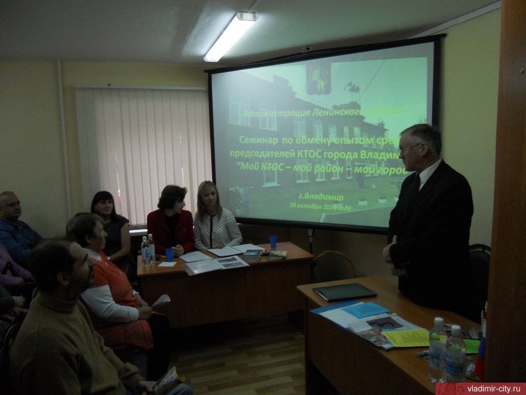 - 28 октября в Ленинском района на базе КТОС микрорайона № 3 состоялся выездной семинар для председателей комитетов территориального общественного самоуправления города Владимира. Он завершил эстафету мероприятий по обмену опытом на тему «Мой КТОС — мой район — мой город», инициатором которых выступило управление по связям с общественностью и СМИ городской администрации.