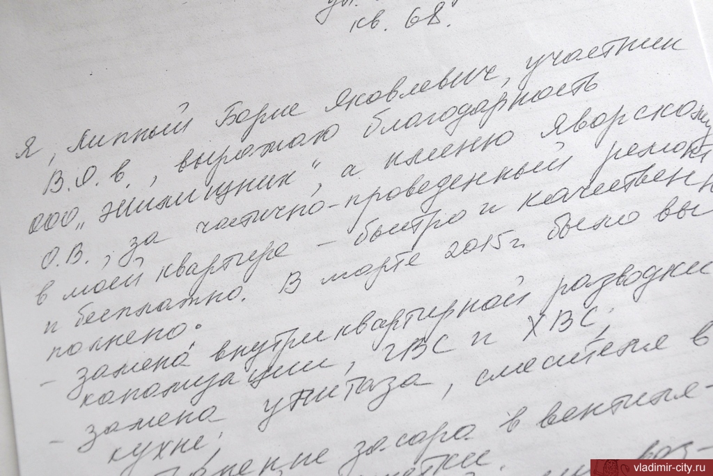 В администрацию города поступают письма от ветеранов со словами благодарности за проведенные ремонтные работы. Так, участник Великой Отечественной войны Борис Яковлевич Липный выражает благодарность сотрудникам ООО «Жилищник» за качественные и бесплатные работы по ремонту канализации и замене сантехники.